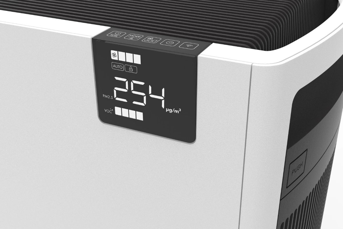 - Aktiver Laserpartikelsensor: Bestimmt die genauen Werte der Luftqualität in Echtzeit